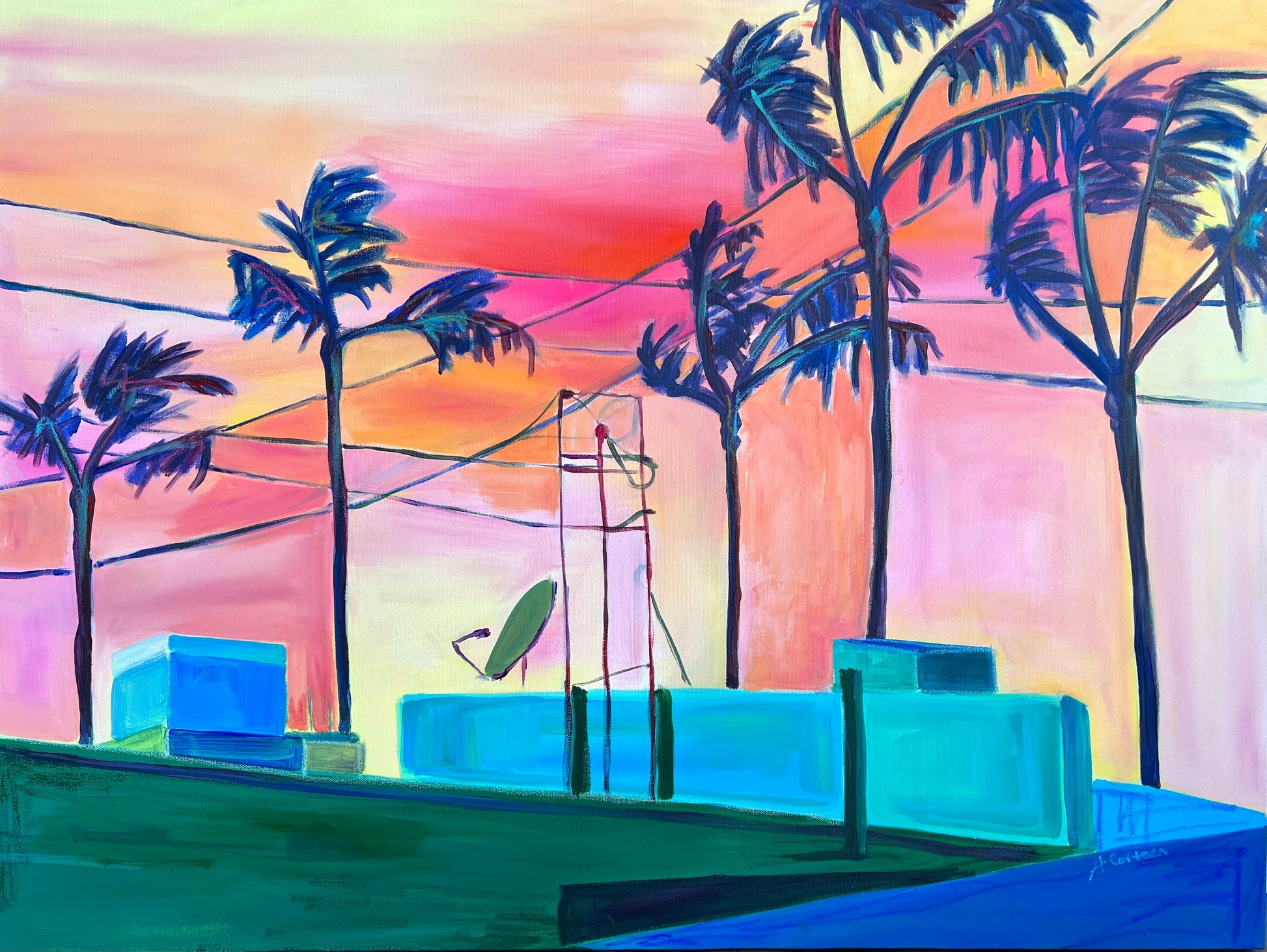 Power lines and palm trees are an iconic feature of the LA skyline. In this painting I was inspired by the silhouettes created at sunset while I was out walking in North Redondo. The scene I photographed was industrial but the silhouettes and colorful sky create a beautiful sunset scene along with the interesting use of shapes and colors.